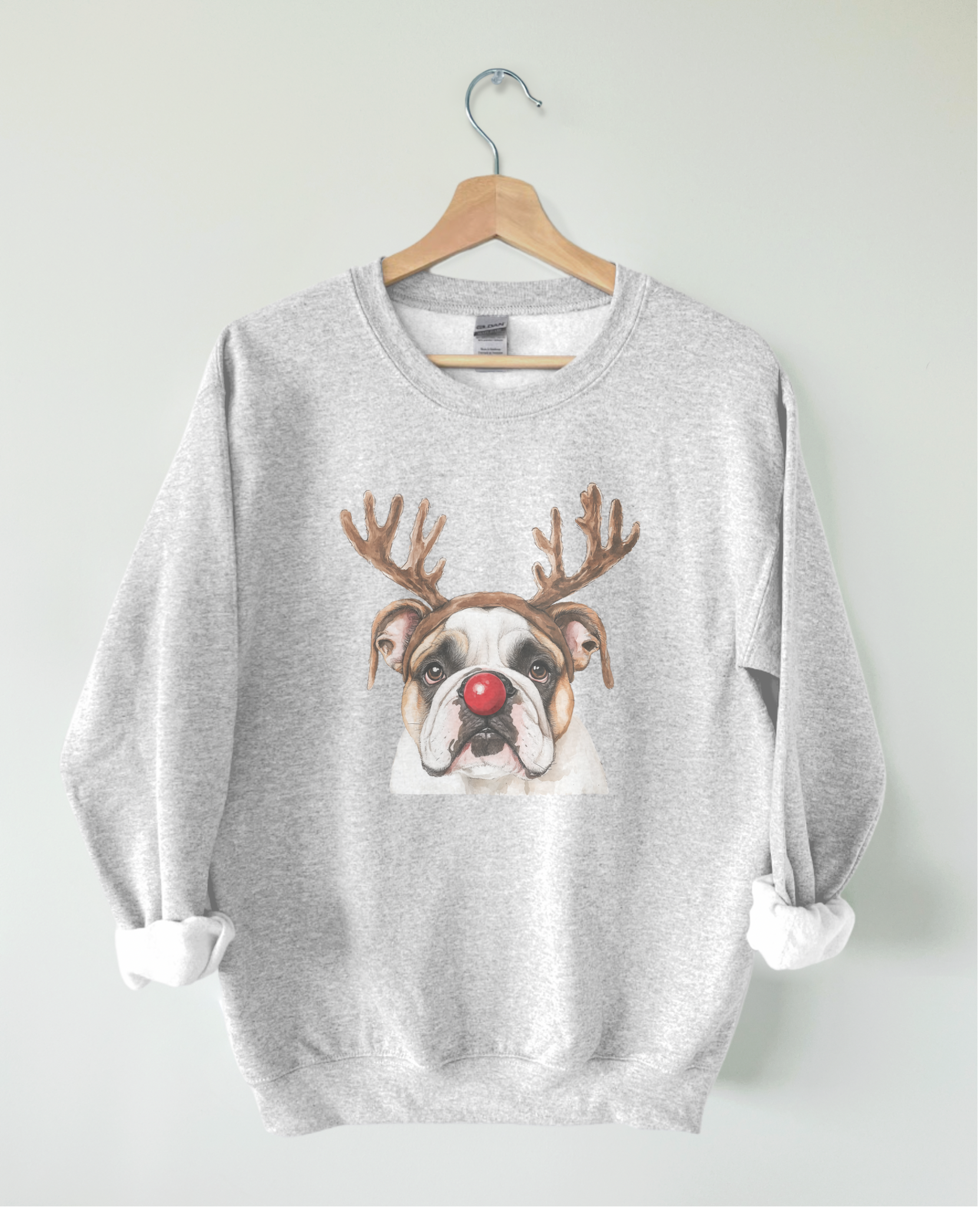 Bulldog holiday/Christmas Sweatshirt. Embroidered black thread, no feel design! 50% cotton, 50% polyester. Durable unisex ash crewneck sweatshirt.
