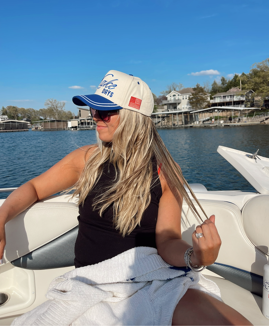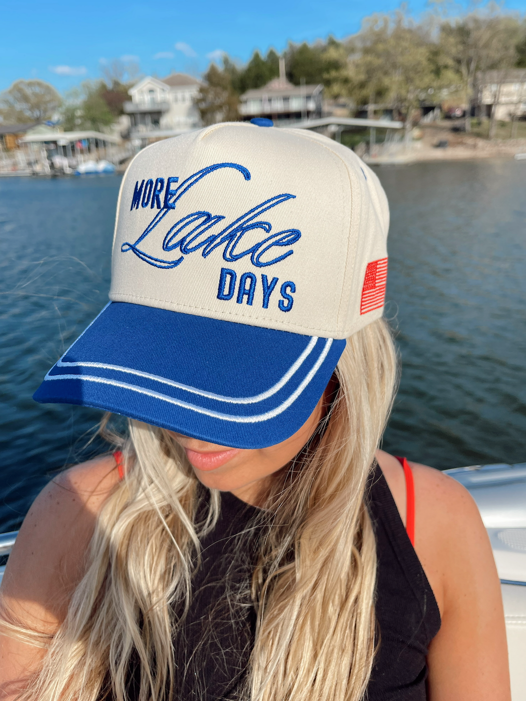 This hat is perfect for enjoying sunny summer days by the lake, Memorial Day, the 4th of July, and beyond. With its royal blue vintage design, intricate side embroidery, and striped bill accents, it is sure to be a top choice!